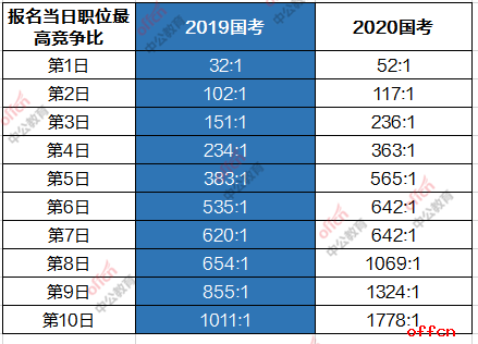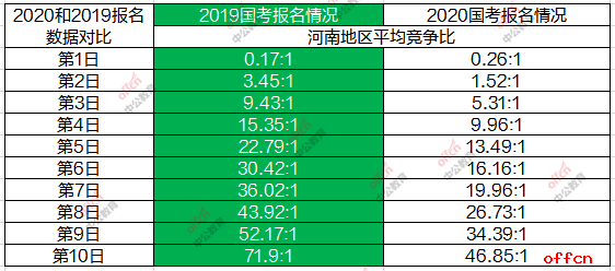 對比19國考報名期間每日競爭比的職位來看,20國考河南地區(qū)每日報名職位競爭比,遠超去年。