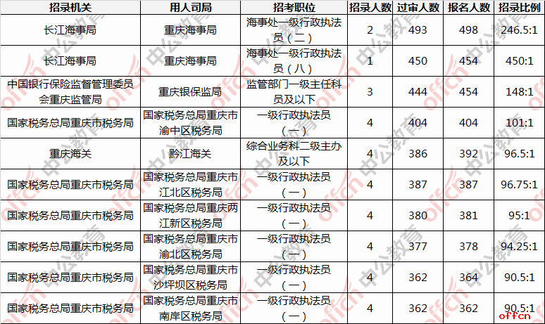 重慶海事局的海事處一級行政執(zhí)法員(二)依然是報名人數(shù)最多的崗位,目前已有498人報名,過審人數(shù)為493人,環(huán)比昨日新增92人報名,過審人數(shù)新增116人。該崗位招錄2人,需要環(huán)境工程、化學(xué)、應(yīng)用化學(xué)專業(yè),但不限基層工作經(jīng)歷,不限政治面貌,本科及以上學(xué)歷的應(yīng)屆生即可報名,要求較低,故備受考生青睞。黔江海關(guān)綜合業(yè)務(wù)二級主辦及以下一職后繼乏力,掉落第五。海事局海事處一級行政執(zhí)法員(八)和銀保監(jiān)會監(jiān)管部門一級主任科員及以下以454并列第二,這3個崗位是目前報名人數(shù)最多的前三名。