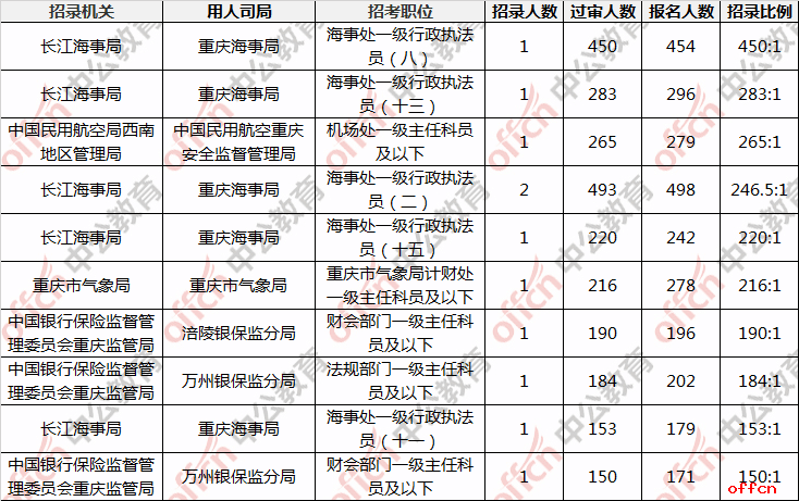 截至24日17:30,報名人數(shù)前三位的部門分別是稅務(wù)系統(tǒng)、長江海事局,重慶銀保監(jiān),三個部門報名總數(shù)22535人,占重慶總報名人數(shù)的87.65%,其中稅務(wù)系統(tǒng)居高不下,以報名人數(shù)17713人一騎絕塵,遙遙其他系統(tǒng),平均競爭比53.68:1。中國民航競爭比高達265:1,也是目前競爭較大的職位之一,斷層超越其他系統(tǒng)。競爭比稍低的崗位是消防救援總隊,競爭比3.25:1,長江航運競爭比8.8:1,報考此崗位的同學(xué)就人數(shù)上來說競爭壓力較小,但萬不可掉以輕心,依然需要全情投入到備考當中。