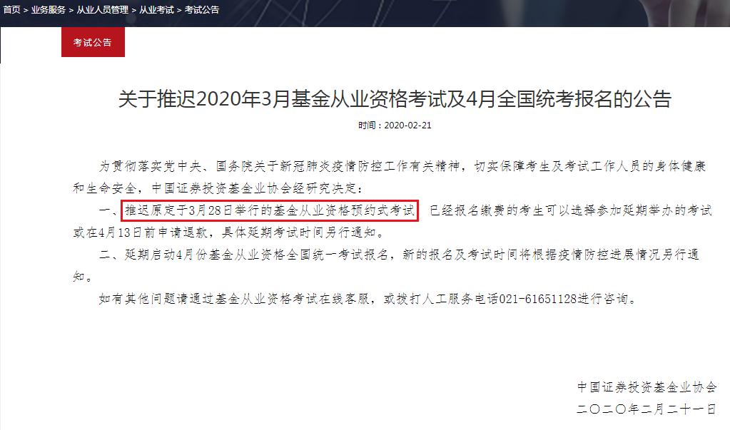 為貫徹落實(shí)黨中央、國務(wù)院關(guān)于新冠肺炎疫情防控工作有關(guān)精神,切實(shí)保障考生及考試工作人員的身體健康和生命安全,中國證券投資基金業(yè)協(xié)會經(jīng)研究決定: