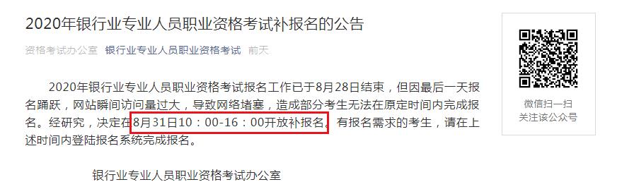 2020年福建中級銀行業(yè)專業(yè)人員職業(yè)資格考試報(bào)名工作已于8月28日結(jié)束,因部分考生未能及時(shí)進(jìn)行報(bào)名,為滿足廣大考生報(bào)考2020年福建中級銀行從業(yè)資格考試需求,經(jīng)研究,決定在8月31日10:00-16:00開放補(bǔ)報(bào)名,詳細(xì)內(nèi)容如下: