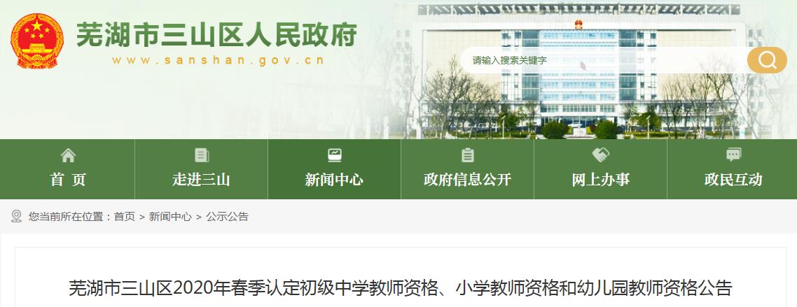 從蕪湖市三山區(qū)人民政府獲悉,2020春季安徽蕪湖市三山區(qū)認(rèn)定中學(xué)小學(xué)和幼兒園教師資格公告已公布,網(wǎng)上申報時間為7月19日至23日,具體詳情如下: