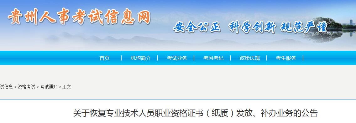 二、考生可通過貴州人事考試信息網(wǎng)(http://pta.guizhou.gov.cn)“考生服務(wù)”欄目,查看《貴州省資格考試查分、補(bǔ)辦合格證書(出具證明)辦事指南》,了解相關(guān)證書補(bǔ)辦流程。