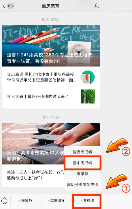 ➤第二步:點(diǎn)擊下方菜單①“查成績(jī)”欄目中的②“查中考成績(jī)”,即可進(jìn)入查詢頁(yè)面,輸入準(zhǔn)考證號(hào)和中考填報(bào)志愿時(shí)設(shè)置的密碼,查詢中考成績(jī)。