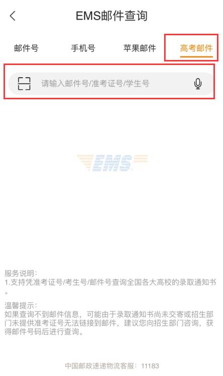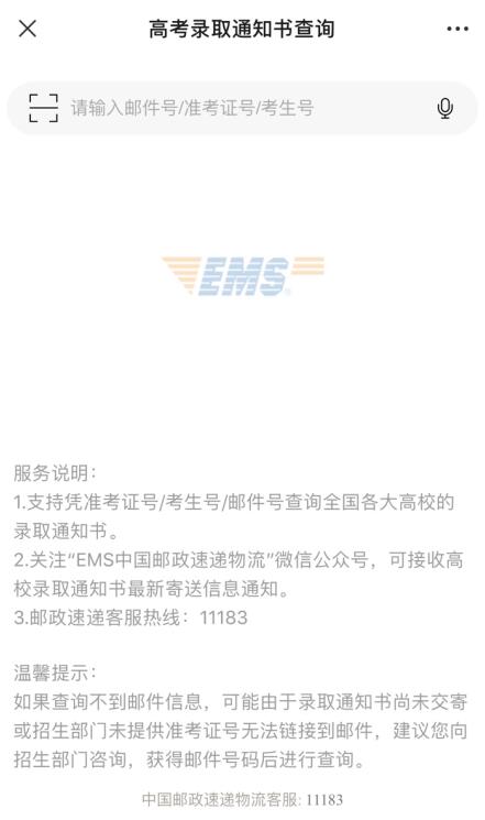 點擊進入【中國郵政速遞物流EMS高考錄取通知書查詢系統(tǒng)】,輸入你的【準考證號】,點擊【提交】即可查詢錄取通知書的派送狀態(tài)。