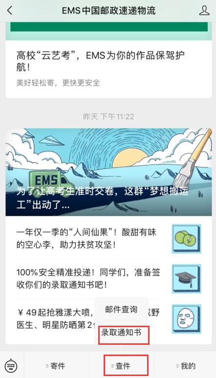 ②、打開聊天對話框,點擊中間的菜單【查件】再返回的信息中,【錄取通知書】