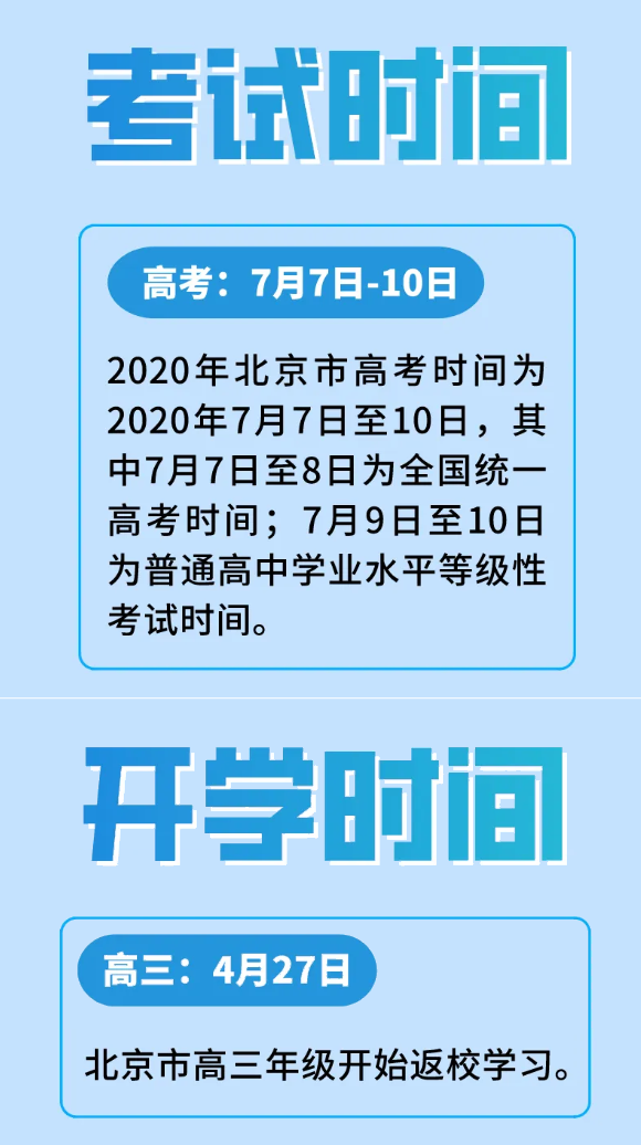 密云高考頻道根據(jù)北京市教育委員會(huì)微信公眾號(hào)公布的《北京市中高考時(shí)間及初高三開學(xué)安排出爐》了解到,2020年北京密云高考時(shí)間已公布,安排在7月7日至10日期間,高三年級(jí)開學(xué)時(shí)間為4月27日,具體詳情如下: