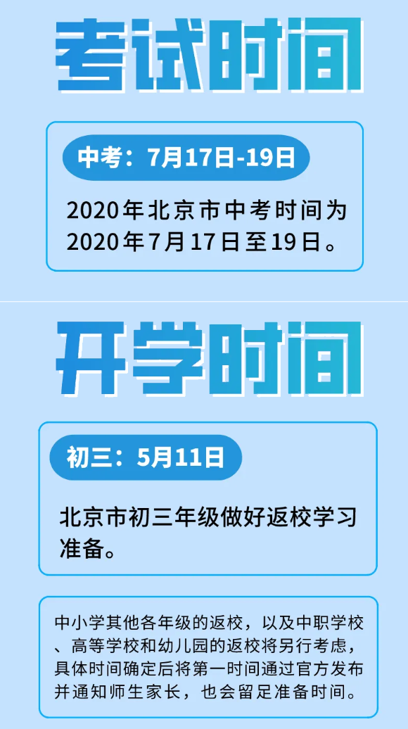崇文中考頻道根據(jù)北京市教育委員會微信公眾號公布的《北京市中高考時(shí)間及初高三開學(xué)安排出爐》了解到,2020年北京崇文中考時(shí)間已公布,安排在7月17日至19日期間,初三年級開學(xué)時(shí)間為5月11日,具體詳情如下: