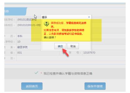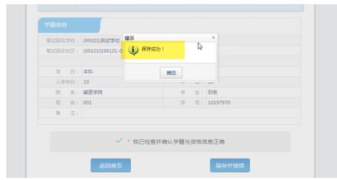 15、如果在考生“網(wǎng)上報名時間”內(nèi),檢查學(xué)籍信息與資格信息無誤后,勾選確認(rèn),點擊“保存并繼續(xù)”