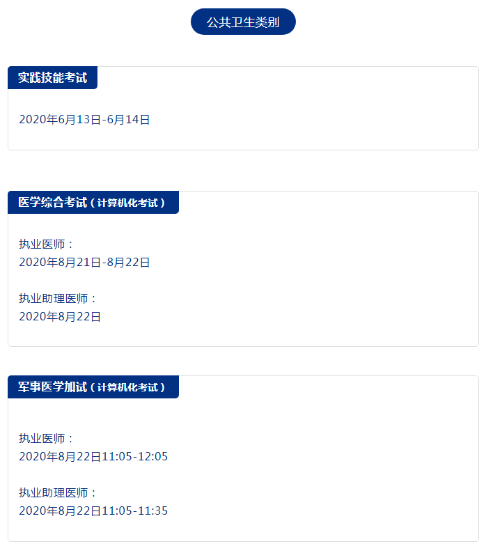 口腔類別、公共衛(wèi)生類別、中醫(yī)類別中醫(yī)專業(yè)、中醫(yī)類別中西醫(yī)結(jié)合專業(yè)執(zhí)業(yè)醫(yī)師資格考試:2020年8月21日上午9:00—11:00,下午13:30—15:30和8月22日上午9:00—11:00,下午13:30—15:30。軍事醫(yī)學(xué)加試:2020年8月22日上午11:05—12:05。