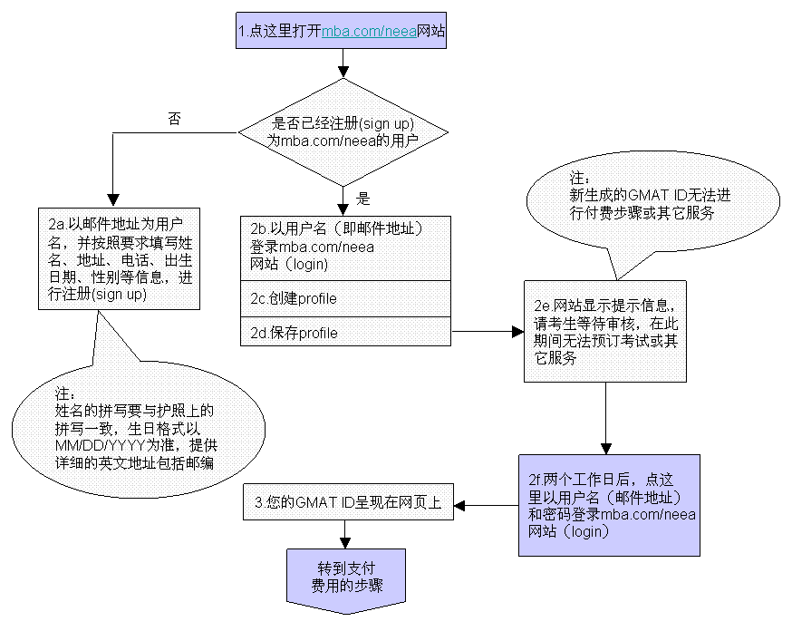 當(dāng)考生成功注冊(cè)為mba.com/neea的網(wǎng)站用戶,并獲得GMAT ID后,即可登錄etest網(wǎng)站,點(diǎn)擊付費(fèi)鏈接,使用GMAT ID,mba.com/neea注冊(cè)用戶名(email地址)和生日三項(xiàng)聯(lián)合信息進(jìn)行登錄,開(kāi)始進(jìn)入付費(fèi)程序。