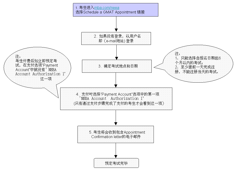 首次進(jìn)行GMAT考試預(yù)定的考生,在確定完成第一步和第二步之后,登錄etest網(wǎng)站,進(jìn)入mba.com/neea選擇考試預(yù)定的鏈接,按照指導(dǎo)選擇考試地點(diǎn)和日期后,點(diǎn)擊next,進(jìn)入支付頁(yè)面,在payment on account 中選擇第一項(xiàng)“NEEA Account Authorization 1 (Remaining Balance : $ US****,**) 。請(qǐng)注意,只有通過(guò)上述第二步支付步驟完成了支付的考生才會(huì)看到此選項(xiàng)。點(diǎn)擊next,預(yù)定考試完成。此后,考生將會(huì)收到包含確認(rèn)函(Appointment Confirmation Letter)的電子郵件,至此,考生的GMAT考試預(yù)定完畢。