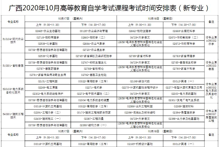 點(diǎn)擊查看完整版>>>廣西2020年10月高等教育自學(xué)考試課程考試時間安排表(新專業(yè))