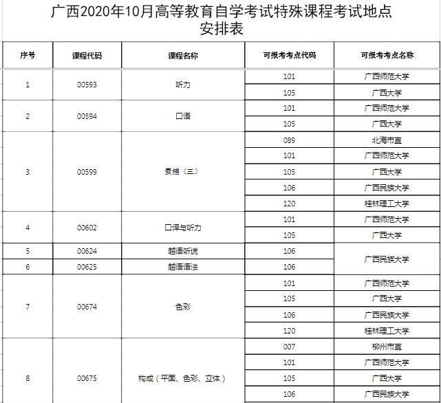 點(diǎn)擊查看完整版>>>廣西2020年10月高等教育自學(xué)考試特殊課程考試地點(diǎn)安排表