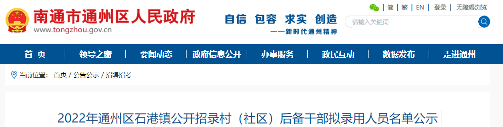 2022年通州區(qū)石港鎮(zhèn)公開招錄村(社區(qū))后備干部擬錄用人員名單公示