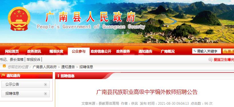 2021云南文山廣南縣民族職業(yè)高級中學(xué)編外教師招聘7人,報名時間:2021年8月30日至2021年9月1日,現(xiàn)將招聘公告原文發(fā)布如下: