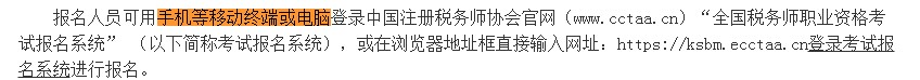報(bào)名人員可用手機(jī)等移動終端或電腦登錄中國注冊稅務(wù)師協(xié)會(www.cctaa.cn)“全國稅務(wù)師職業(yè)資格考試報(bào)名系統(tǒng)”(以下簡稱考試報(bào)名系統(tǒng)),或在瀏覽器地址框直接輸入網(wǎng)址:https://ksbm.ecctaa.cn 登錄考試報(bào)名系統(tǒng)進(jìn)行報(bào)名。