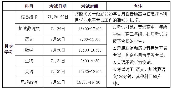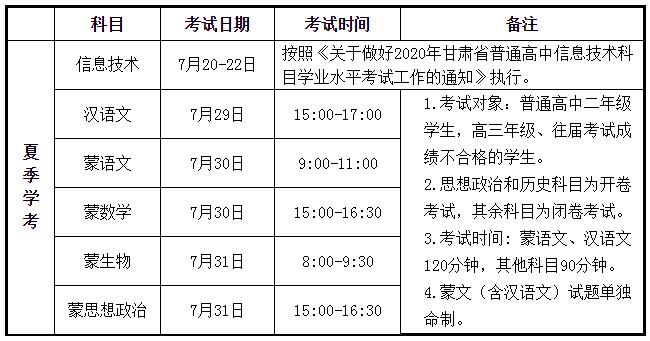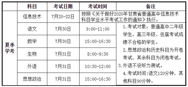 張掖會考頻道根據(jù)甘肅省教育考試院公布的《關(guān)于2020年甘肅省普通高中學(xué)業(yè)水平考試科目及時間安排的通知》了解到,2020年夏季甘肅張掖普通高中學(xué)業(yè)水平考試時間已公布,甘肅張掖夏季學(xué)考具體時間安排在7月29日至31日期間舉行,具體考試科目如下:
