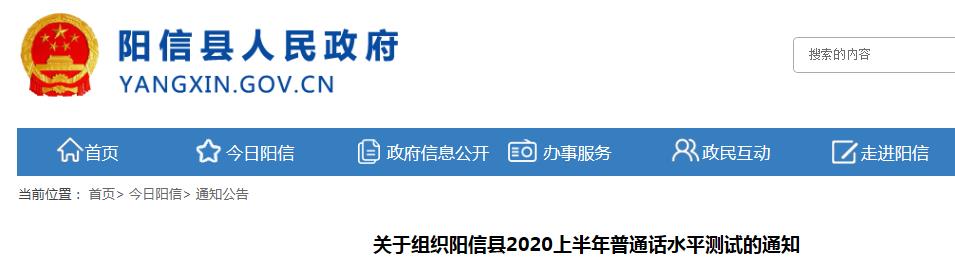 2.請受理普通話報名工作的單位告知報名人員及時參加測試,并請被測試人員之間相互轉(zhuǎn)告。本通知將在陽信政府網(wǎng)http://www.yangxin.gov.cn“公告通知”欄發(fā)布。