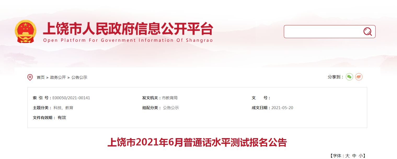 從上饒市人民政府發(fā)布的《2021年6月江西上饒普通話水平測試報名公告》得知,2021年6月江西上饒普通話成績查詢時間及證書領(lǐng)取已公布,成績查詢時間為考后50個工作日,具體詳情如下: