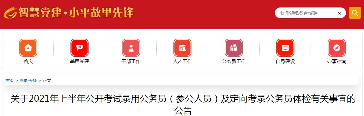 根據(jù)《中共廣安市委組織部關于2021年上半年公開考試錄用公務員(參公人員)的公告》《中共四川省委組織部關于2021年從優(yōu)秀村(社區(qū))干部、優(yōu)秀工人農民、服務基層項目人員、事業(yè)編制人員、退役士兵中考試錄用公務員(參公人員)的公告》規(guī)定,現(xiàn)將2021年上半年廣安市公開考試錄用公務員(參公人員)及定向考錄體檢有關事宜公告如下: