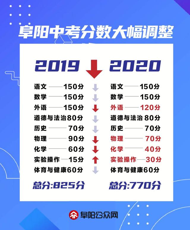 中考頻道從阜陽市教育局了解到,2020年阜陽中考分?jǐn)?shù)大幅調(diào)整!總分下降,具體如下: