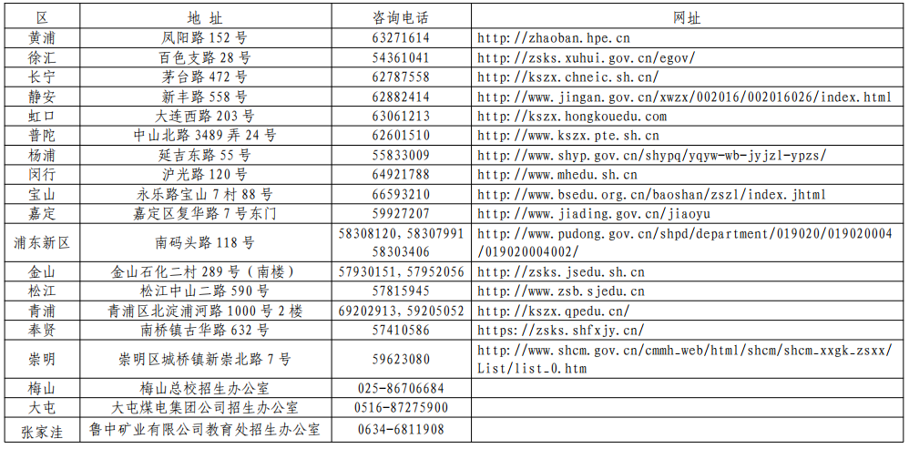 其他考生的報考信息確認(rèn)前須先咨詢相關(guān)區(qū)招考機(jī)構(gòu)(各區(qū)招考機(jī)構(gòu)聯(lián)系方式詳見附件1),獲得區(qū)招考機(jī)構(gòu)針對本區(qū)其他考生報考信息確認(rèn)的要求和安排。