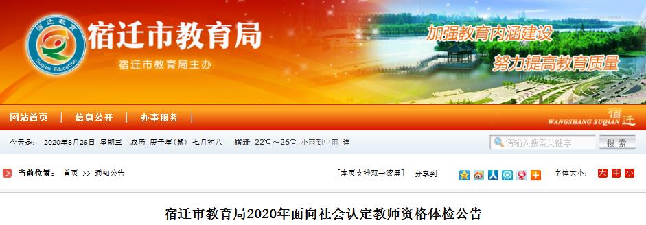 從宿遷市教育局獲悉,2020年江蘇宿遷市面向社會認定教師資格體檢公告已公布,體檢時間為9月6日,具體詳情如下: