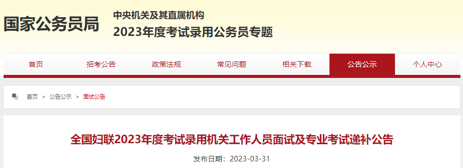 全國婦聯(lián)2023年考試錄用機關(guān)國家公務(wù)員面試及專業(yè)考試遞補公告已公布,為了方便廣大考生的查閱,下面為您詳細(xì)介紹一下本次國家公務(wù)員面試及專業(yè)考試遞補工作的具體事宜,希望廣大考生及時關(guān)注,如有相關(guān)疑問,請關(guān)注國家公務(wù)員頻道為您實時做出的更新。