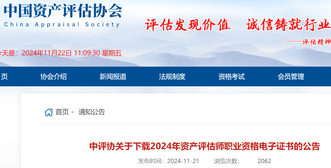 小編根據(jù)中國資產(chǎn)評(píng)估協(xié)會(huì)發(fā)布“中評(píng)協(xié)關(guān)于下載2024年資產(chǎn)評(píng)估師職業(yè)資格電子證書的公告”得知,2024年資產(chǎn)評(píng)估師考試電子證書即日起可通過中國人事考試網(wǎng)下載本人電子證書。