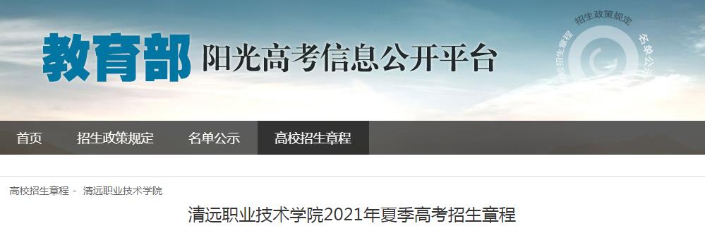 從教育部陽(yáng)光高考信息公開平臺(tái)獲悉,清遠(yuǎn)職業(yè)技術(shù)學(xué)院2021年夏季高考招生章程已公布,具體詳情如下: