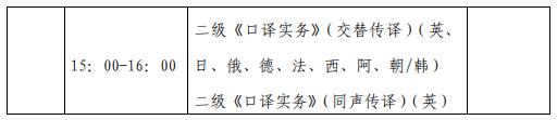 (一)口譯考試。一級(jí)設(shè)《口譯實(shí)務(wù)》1個(gè)科目,二、三級(jí)設(shè)《口譯綜合能力》和《口譯實(shí)務(wù)》2個(gè)科目。其中,目前僅二級(jí)英語(yǔ)《口譯實(shí)務(wù)》科目同時(shí)分設(shè)“交替?zhèn)髯g”“同聲傳譯”,其他的《口譯實(shí)務(wù)》只設(shè)“交替?zhèn)髯g”。