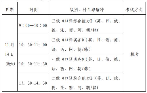 根據(jù)2020年度職業(yè)資格考試計(jì)劃以及常態(tài)化疫情防控形勢(shì)下考試事項(xiàng)調(diào)整等有關(guān)精神,2020年度上、下半年翻譯考試合并組織,于11月14日、15日統(tǒng)一舉行??谧g和筆試考試均實(shí)行電子化考試形式(以下稱機(jī)考)。具體考試時(shí)間和科目為: