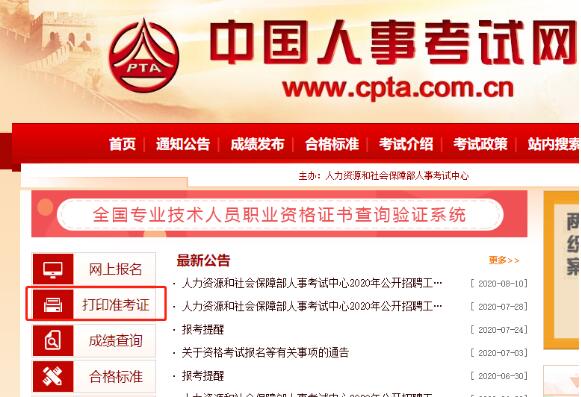 1、登錄中國人事考試網(http://www.cpta.com.cn/),點擊左側“打印準考證”按鈕;如圖示(點擊圖片可進入中國人事考試網):
