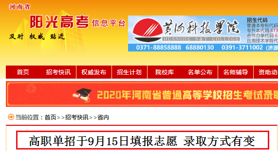 今年單招面向已通過2020年河南省普通高校招生考試報名和對口招收中等職業(yè)學(xué)校畢業(yè)生考試報名,未被統(tǒng)一高考、對口招生等其他類型的普通高校招生考試錄取的考生??忌捎?月15日9時至9月17日18時登錄“河南省普通高校招生考試服務(wù)平臺”(http∶//pzwb.heao.gov.cn)進行志愿填報。