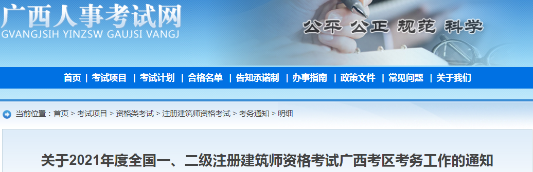 根據(jù)人力資源和社會(huì)保障部人事考試中心、住房和城鄉(xiāng)建設(shè)部執(zhí)業(yè)資格注冊(cè)中心《關(guān)于2021年度全國(guó)一、二級(jí)注冊(cè)建筑師資格考試考務(wù)工作的通知》(人考中心函〔2021〕4號(hào))精神,為做好2021年度全國(guó)一、二級(jí)注冊(cè)建筑師資格考試廣西考區(qū)考務(wù)工作,現(xiàn)將有關(guān)事項(xiàng)通知如下: