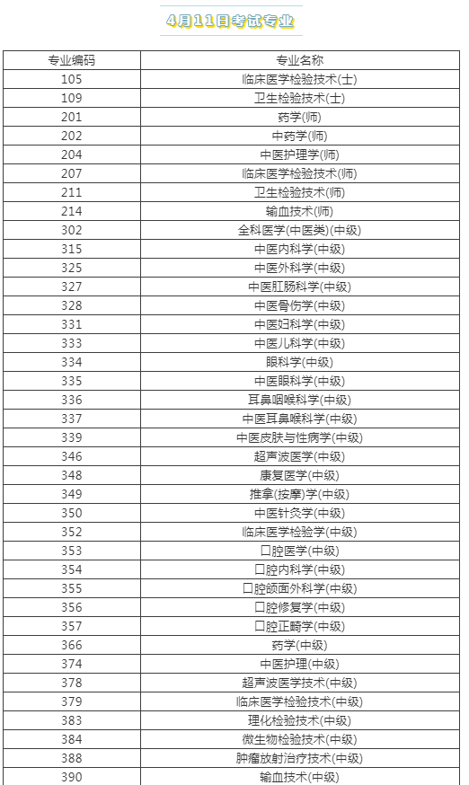 藥學(xué)(師,專業(yè)代碼201)、臨床醫(yī)學(xué)檢驗(yàn)技術(shù)(師,專業(yè)代碼207)專業(yè)考試時間為4月10、11日,護(hù)理學(xué)(中級,專業(yè)代碼368)專業(yè)考試時間為4月17、18日,這三個專業(yè)考試采用平行卷方式,組卷方案相同,平行卷的難度一致。報考以上專業(yè)的考生參加其中1天的考試,請注意查看準(zhǔn)考證上的考試時間,切勿錯過考試。