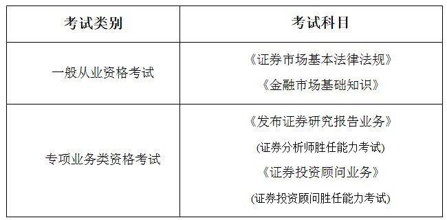 考試安排為“一般從業(yè)資格考試”和“專項(xiàng)業(yè)務(wù)類資格考試”4個(gè)科目。