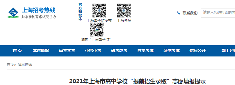 從上海市教育考試院了解到,2021年上海高中學(xué)?!疤崆罢猩浫 敝驹柑顖?bào)提示已經(jīng)發(fā)布,為方便考生了解情況,現(xiàn)將有關(guān)事宜通知如下: