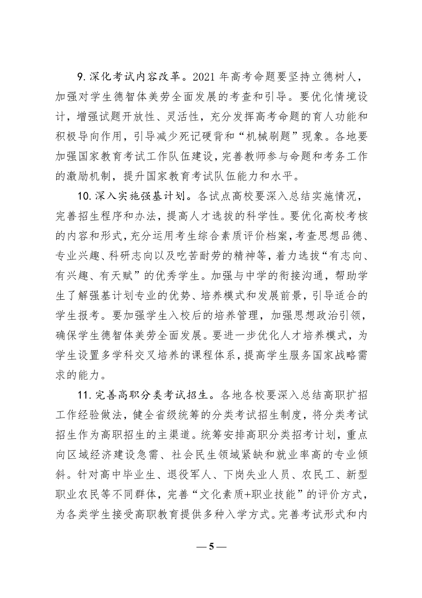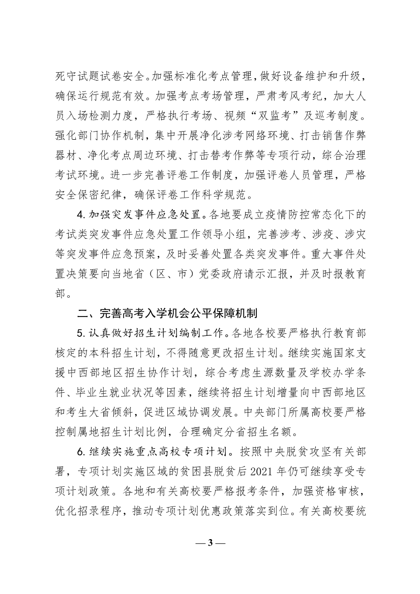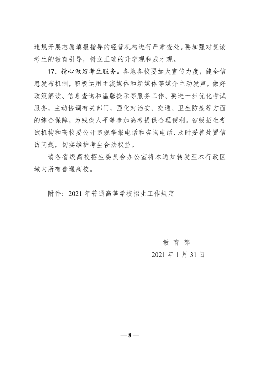 現(xiàn)將《教育部關(guān)于做好2021年普通高校招生工作的通知》(教學(xué)〔2021〕1號(hào))轉(zhuǎn)發(fā)給你們,請(qǐng)認(rèn)真學(xué)習(xí),遵照?qǐng)?zhí)行。
