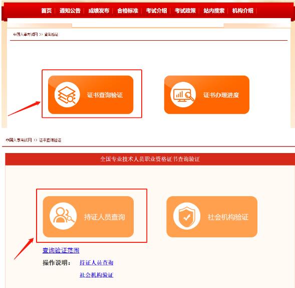 點擊【證書查詢驗證】和【持證人員查詢】,進入【全國專業(yè)技術人員職業(yè)資格證書查詢驗證系統(持證人員查詢)】平臺。