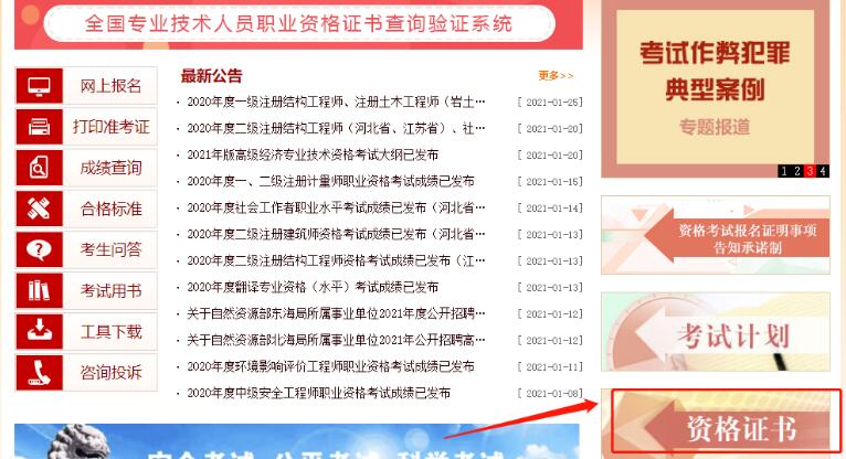 進入中國人事考試網,點擊右側的【資格證書】。(點擊圖片可進入中國人事考試網)