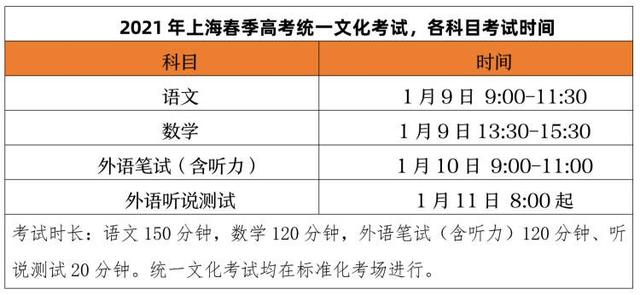 2021年上海黃浦春季高考考試時(shí)間為2021年1月9日-11日舉行全市統(tǒng)一文化考試,各科目考試時(shí)間為: