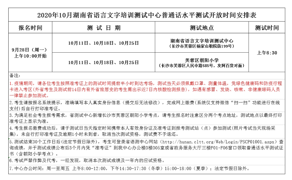 從湖南省語(yǔ)言文字培訓(xùn)測(cè)試中心獲悉,2020年10月湖南省語(yǔ)言文字培訓(xùn)測(cè)試中心普通話水平測(cè)試開(kāi)放時(shí)間安排表已公布,9月28日起報(bào)名,具體詳情如下: