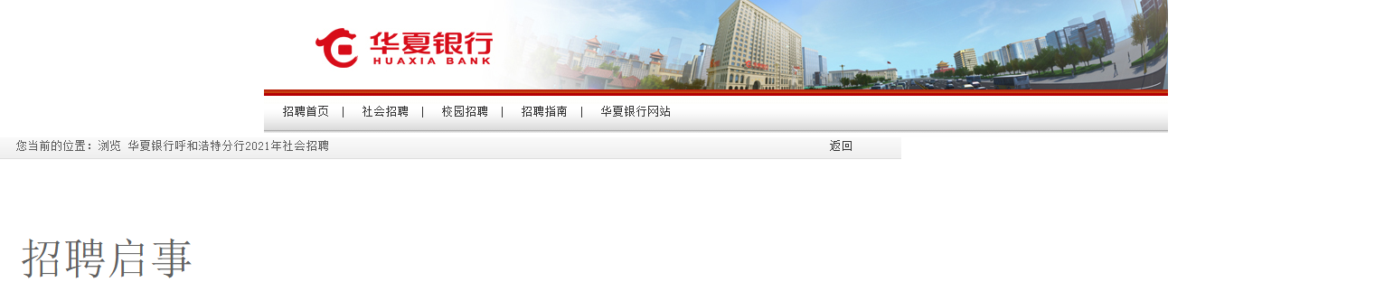 華夏銀行內(nèi)蒙古呼和浩特分行2021年社會招聘啟事已發(fā)布,報(bào)名時(shí)間:2021年8月15日截止,現(xiàn)將招聘詳情發(fā)布如下: