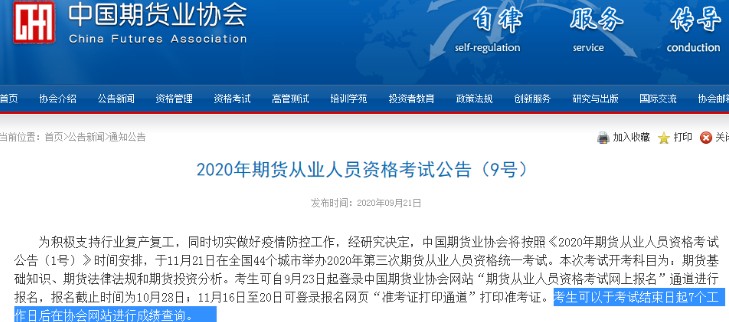 2020年11月21日在全國(guó)44個(gè)城市舉辦第三次期貨從業(yè)人員資格統(tǒng)一考試。青??忌梢杂?span>考試結(jié)束日起7個(gè)工作日后在協(xié)會(huì)網(wǎng)站進(jìn)行成績(jī)查詢。