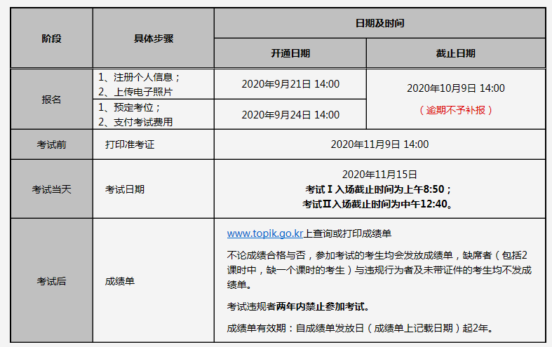 從教育部考試中心海外考試報(bào)名信息網(wǎng)發(fā)布的《2020年11月韓國語能力考試報(bào)名通知》得知,重慶2020年11月韓國語能力考試報(bào)名時(shí)間及報(bào)名入口已公布,9月21日-10月9日進(jìn)行報(bào)名,具體詳情如下: