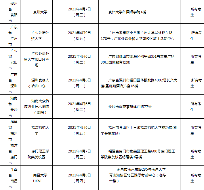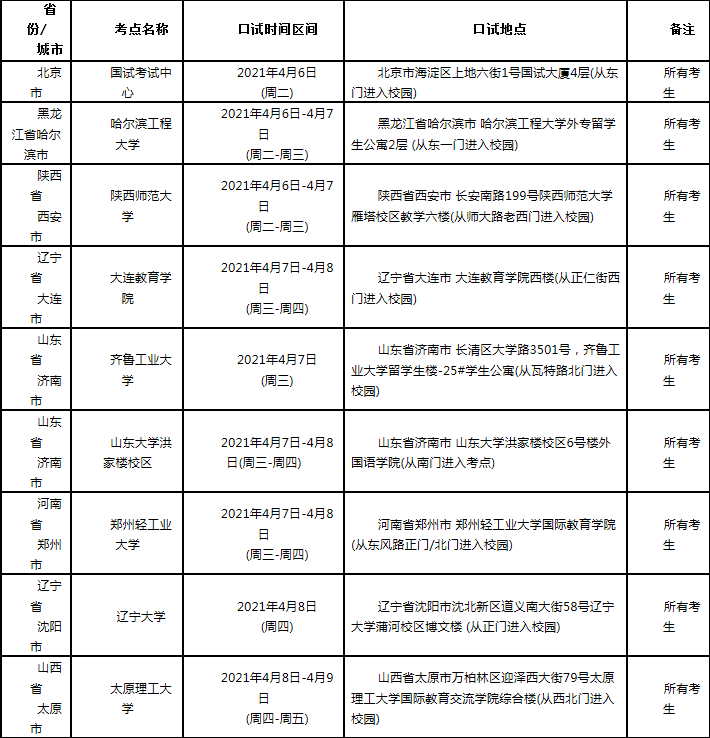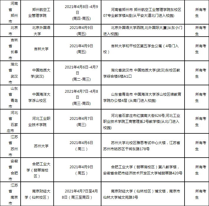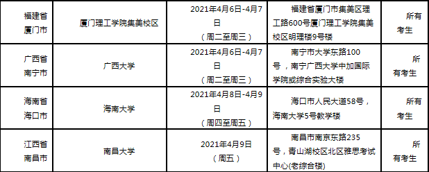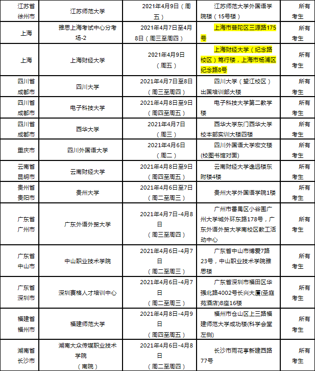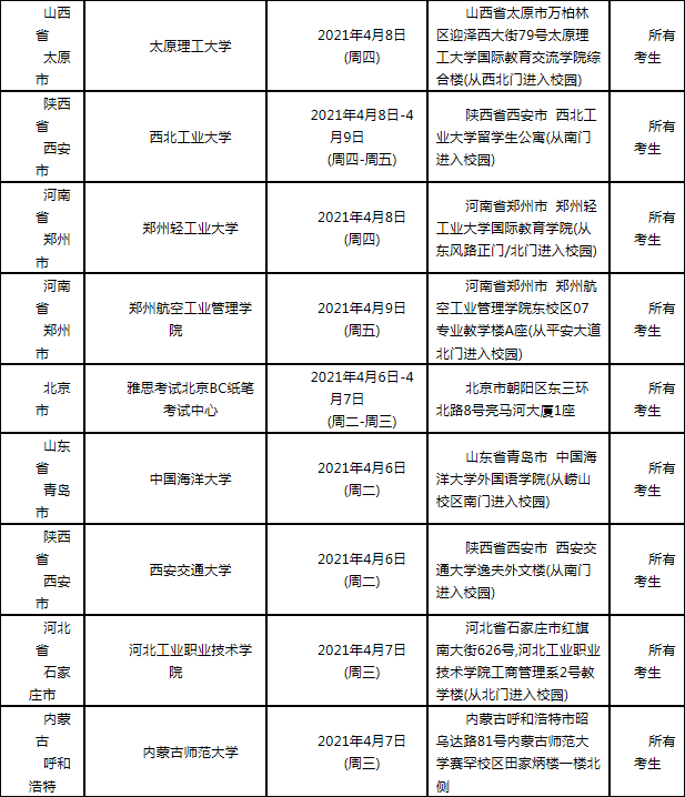 接英國(guó)文化教育協(xié)會(huì)通知,報(bào)考2021年4月10日雅思考試的考生口語(yǔ)安排如下,供廣大考生參考。請(qǐng)按照?qǐng)?bào)名網(wǎng)站公布的準(zhǔn)考證打印時(shí)間登錄雅思考試報(bào)名網(wǎng)站查詢您的口試安排,打印準(zhǔn)考證并以準(zhǔn)考證信息為準(zhǔn)。