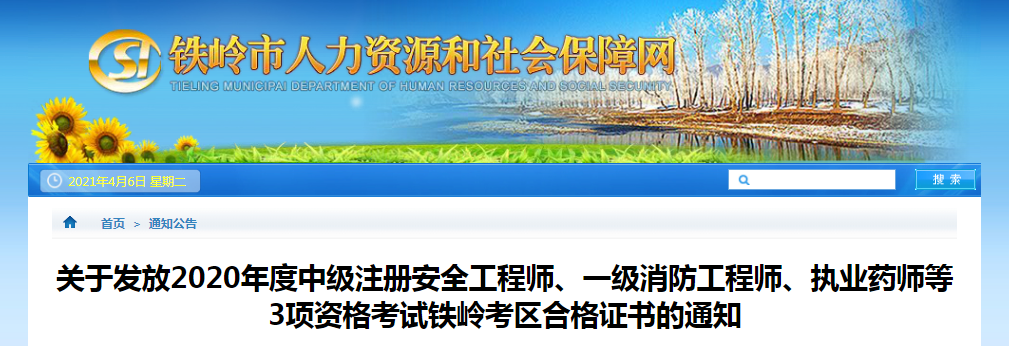鐵嶺市職業(yè)技能鑒定中心(鐵嶺市人事考試中心)定于4月6日起,發(fā)放2020年度中級注冊安全工程師、一級消防工程師、執(zhí)業(yè)藥師等3項資格考試鐵嶺考區(qū)合格證書。現(xiàn)將發(fā)放證書事宜通知如下: