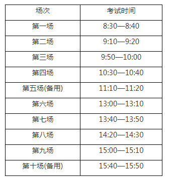2021年上海市初中學(xué)業(yè)水平考試(外語聽說測(cè)試)將于2021年5月29日(星期六)舉行,上午8:30起開考。英語聽說測(cè)試設(shè)8場(chǎng),另設(shè)備用場(chǎng)次2場(chǎng)。每場(chǎng)測(cè)試時(shí)間為10分鐘。英語聽說測(cè)試各場(chǎng)次時(shí)間表如下: